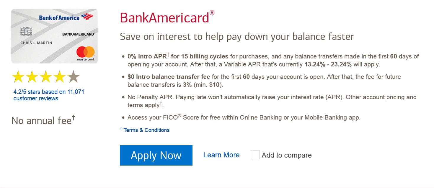 - Introductory 0% APR for your first 18 billing cycles for balance transfers made within 60 days of opening your account.